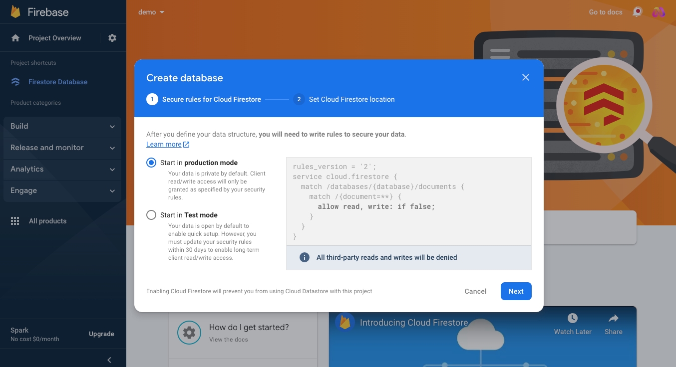 From your firebase console, click on the Firestore Database and then click on the create database button.