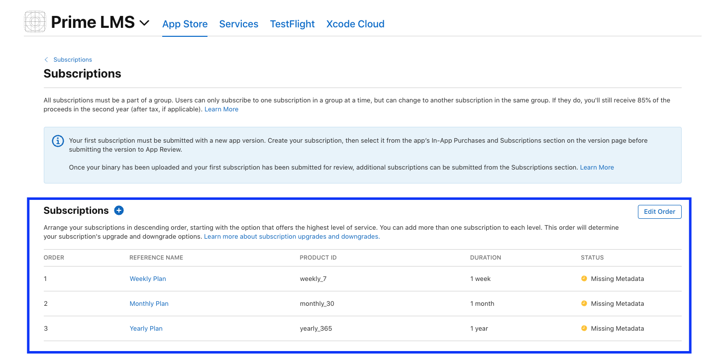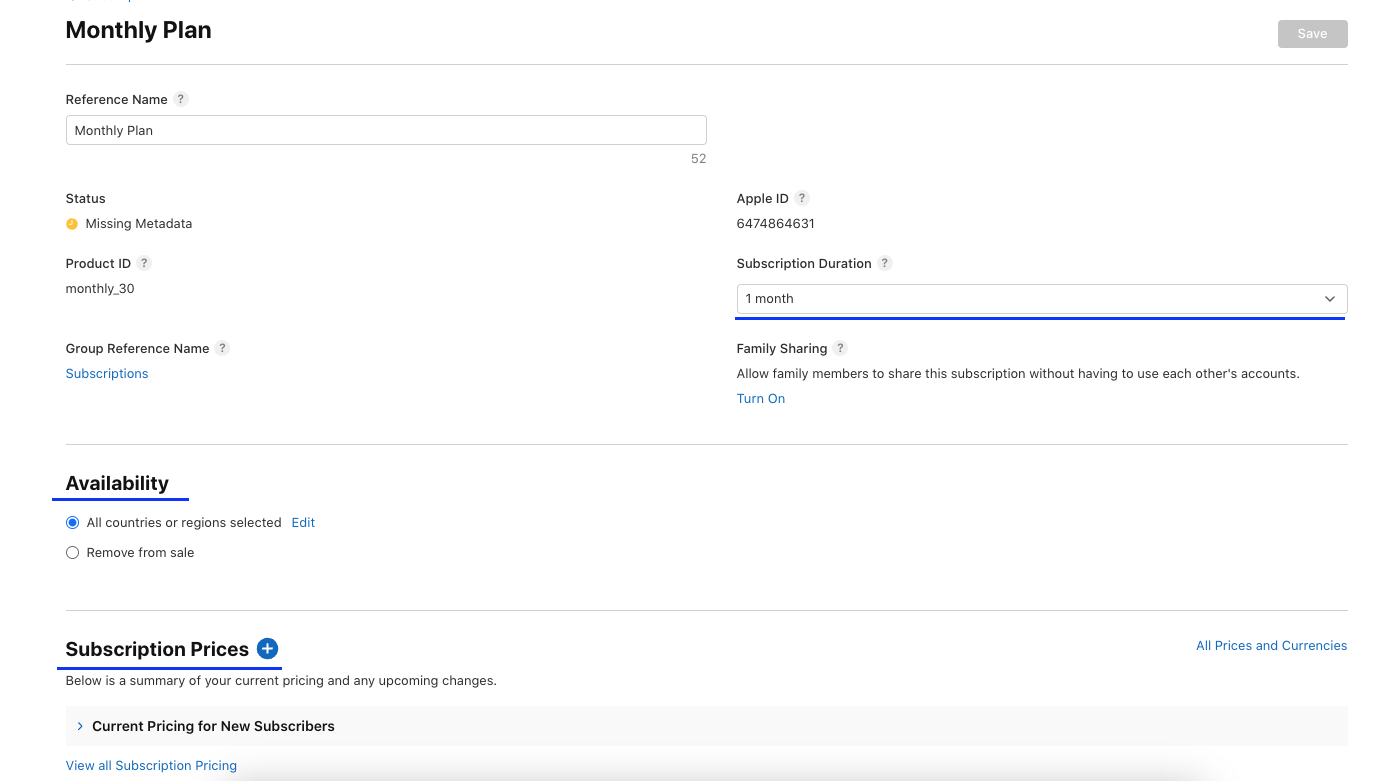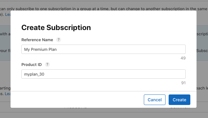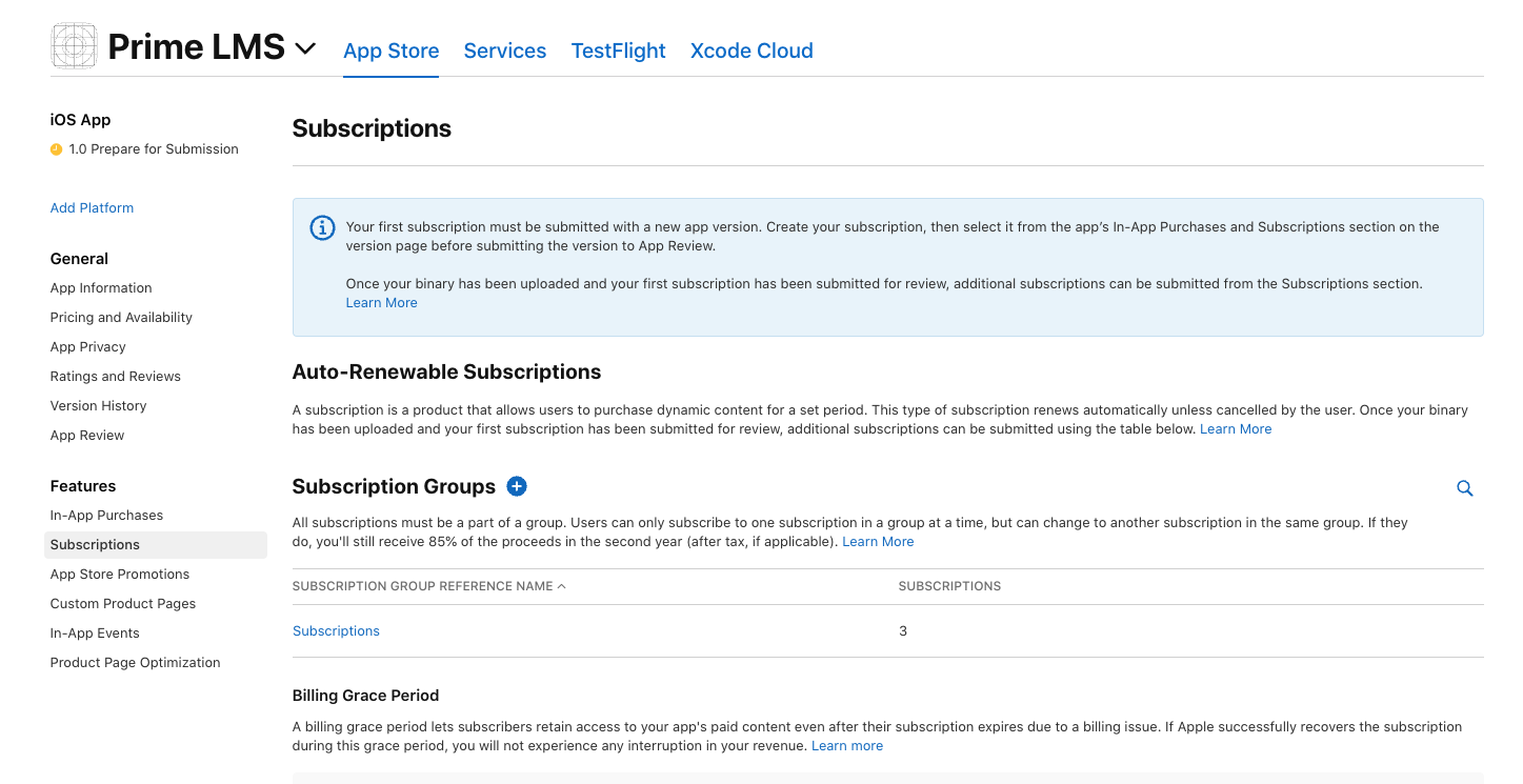 Create A subscription group. Group name can be anything. You will create all of your subscription products within this group.