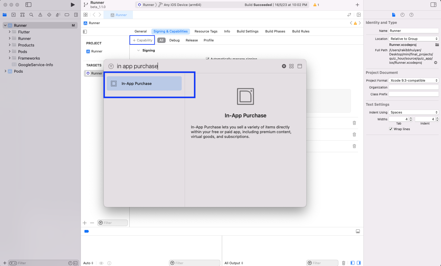 From the app source code open the lms_app/ios folder in your Xcode App. Now go to the Runner > Signing & Capabilities and click on the + Capability and add the In-App Purchase option. That's it.
